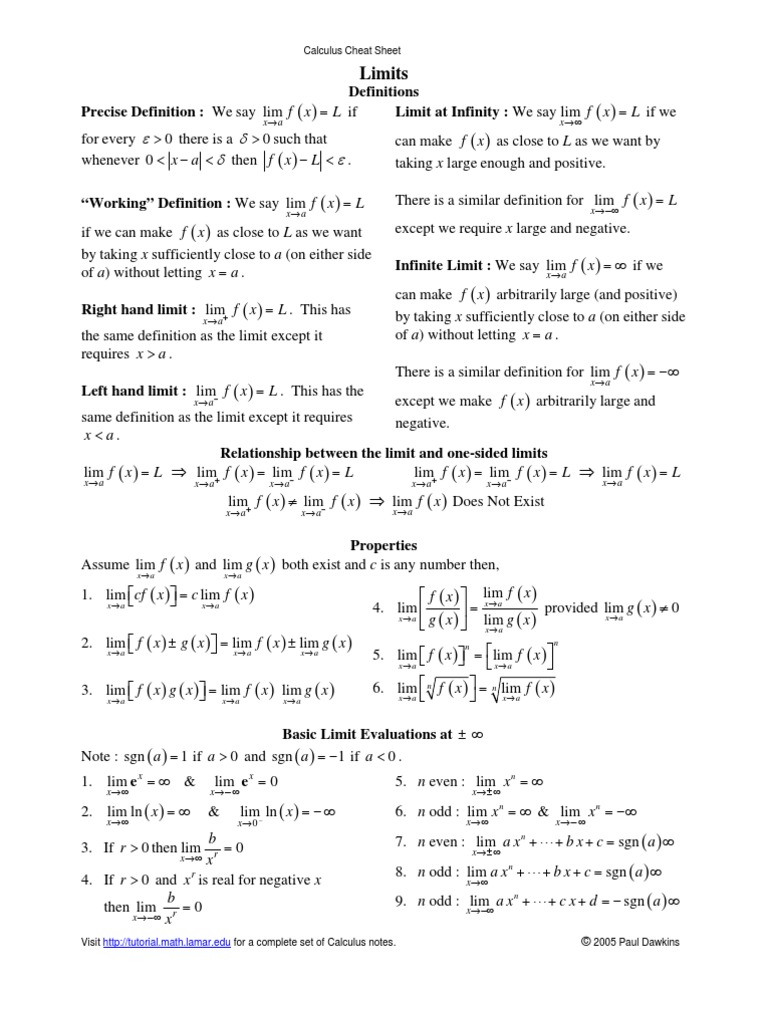 We say ( ) lim x a f x l → = if for every 0 ε > there is a 0 δ > such that whenever 0 x a δ < − < then ( ) f x l ε. X c is an absolute maximum of f x if f c 2. The practice test with printable. View, download and print fillable calculus cheat sheets in pdf format online. Formula to convert into an.